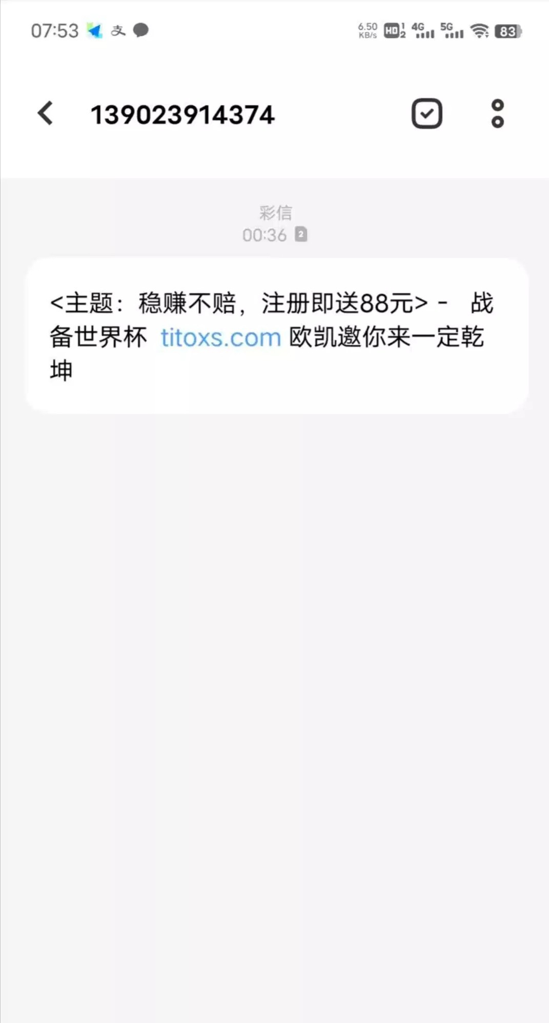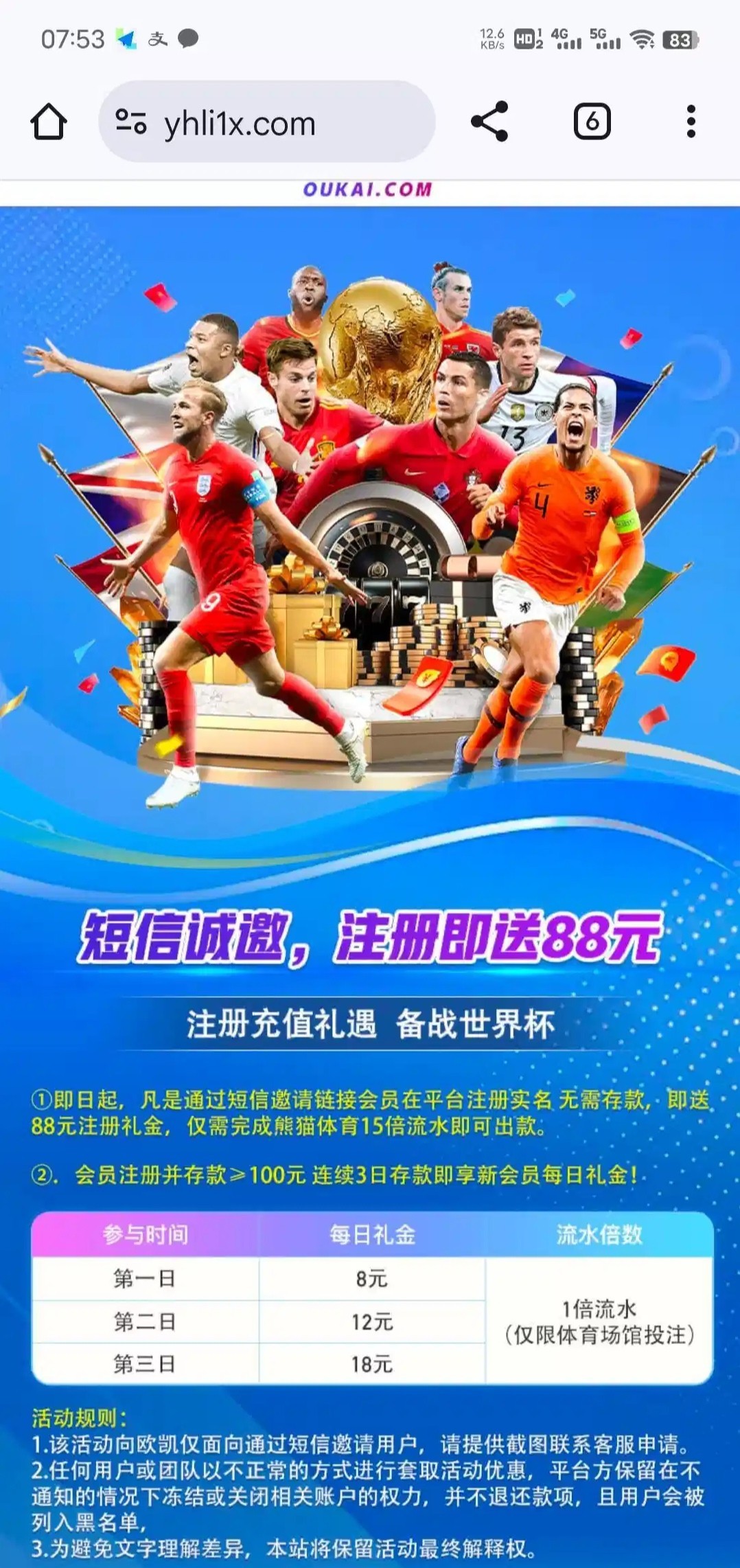 注册送88 注册找客服说领取特邀彩金,88只能打熊猫体育15倍流水,我出了500,开始还以为是黑台,结果提现秒到,应该不需要特邀,我朋友没收到短信注册也送了,必须走短信里面的链接注册才送