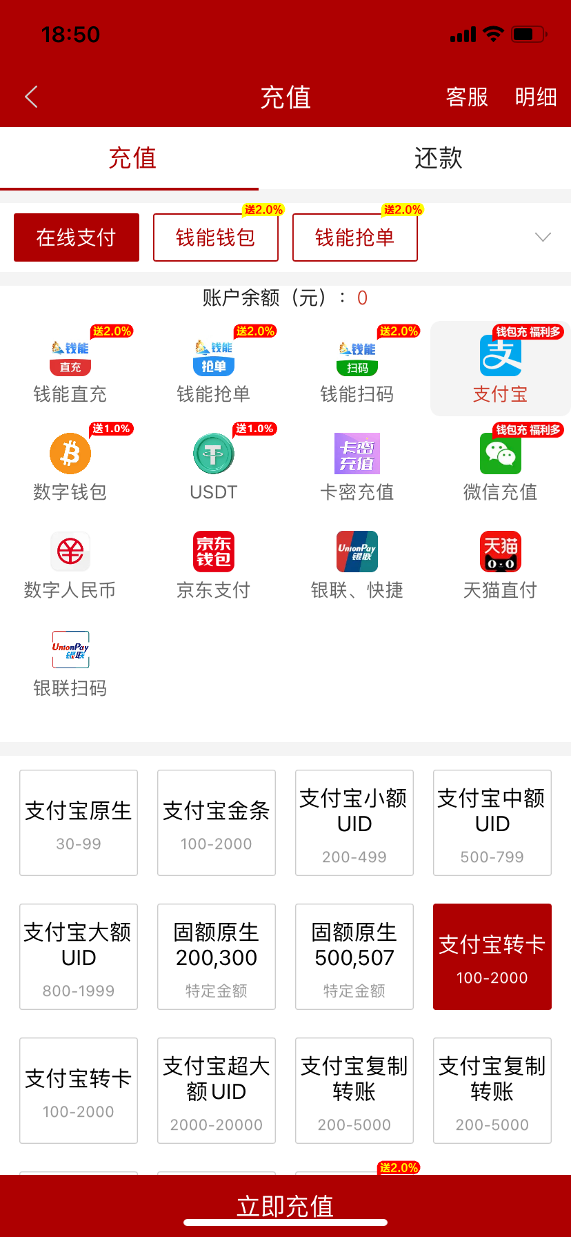 点击在线充值,选择支付宝,里面有支付宝转卡  ,我这边被关了,不显示通道了,如果都没有,那就是取消通道了